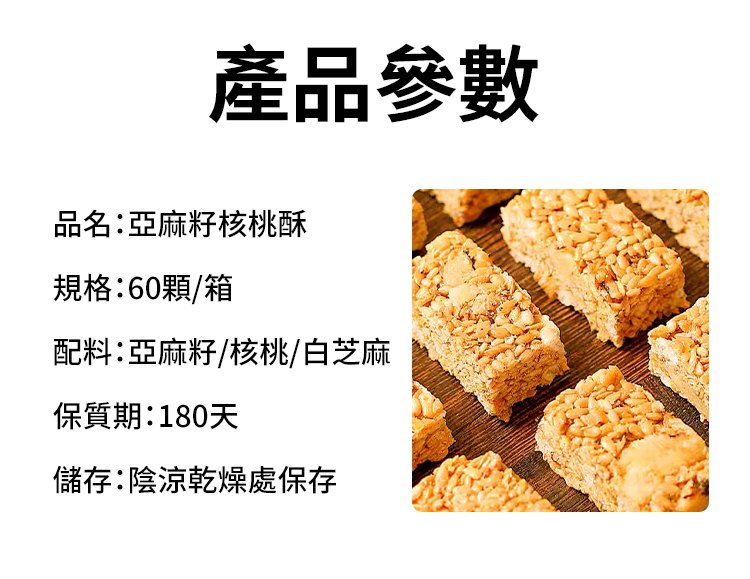 【亞麻籽核桃酥】健康無糖,純天然美味! 嚴選優質亞麻籽與核桃,營養豐富 無糖無添加,健康零負擔 採用木糖醇代替糖分,低卡美味 酥脆口感,入口即化,讓你停不下來 純天然原料,安心享受每一口 精美包裝,送禮自用兩相宜